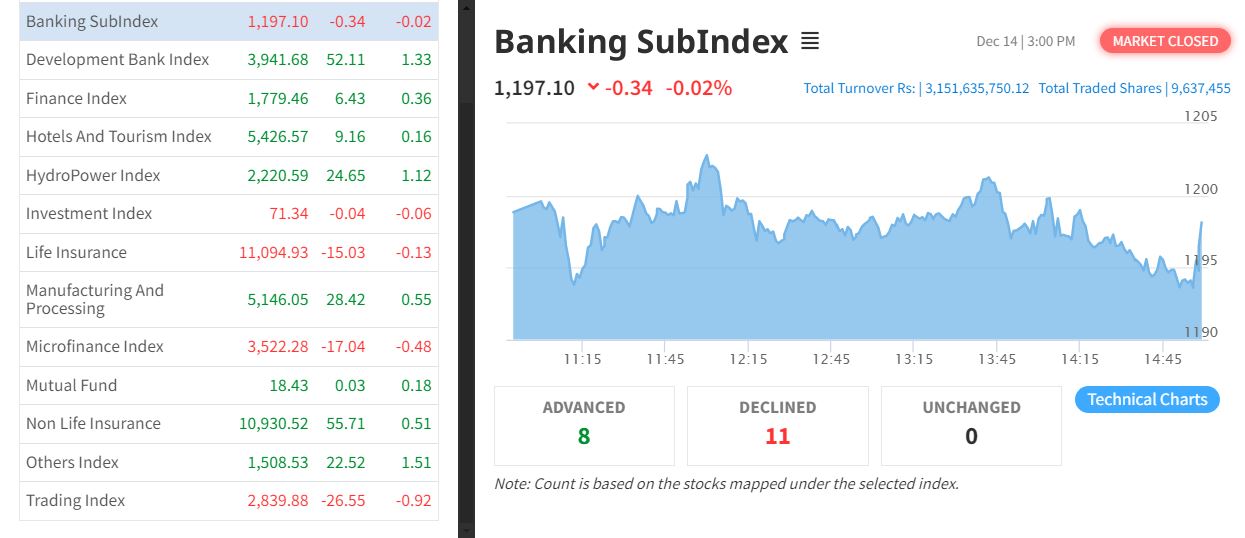 बिहीबार वाणिज्य बैंकसहित ५ वटा उपसूचक ऋणात्मक हुँदा विकास बैंक र निर्जीवन बीमा उपसूचकमा उत्साह कायमै रहयो । वाणिज्य बैंकतर्फ सामान्य गिरावट आउँदा, लघुबित्त र जीवन बीमा उपसमूहमा दोहोरो अंकको गिरावट आएको छ ।