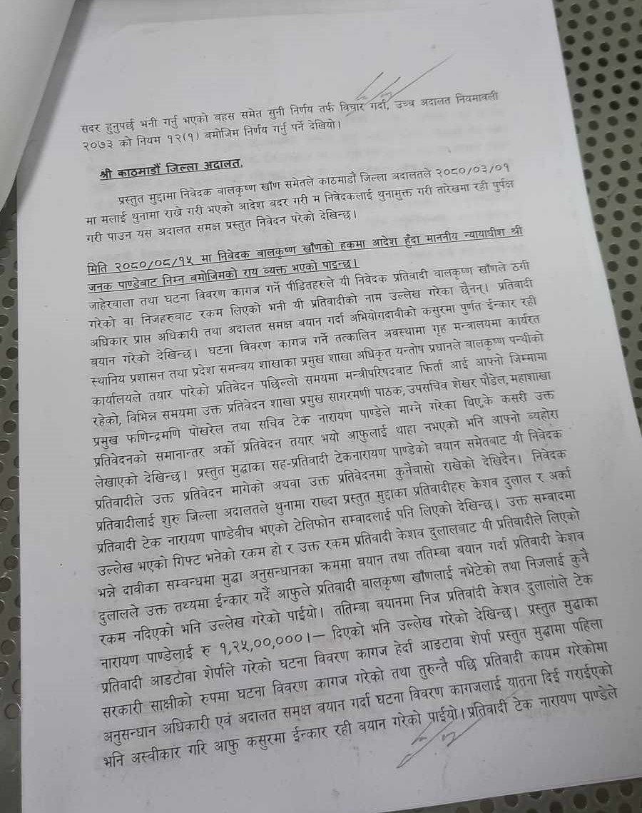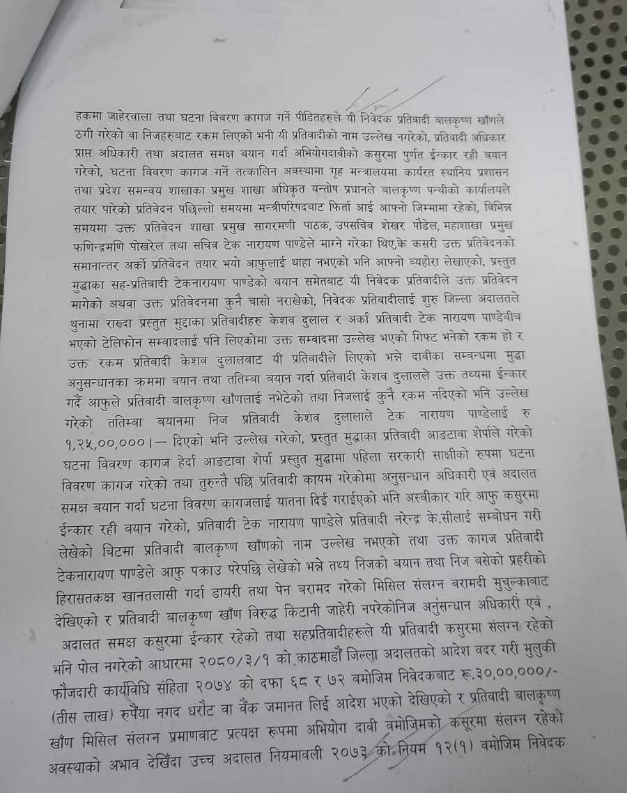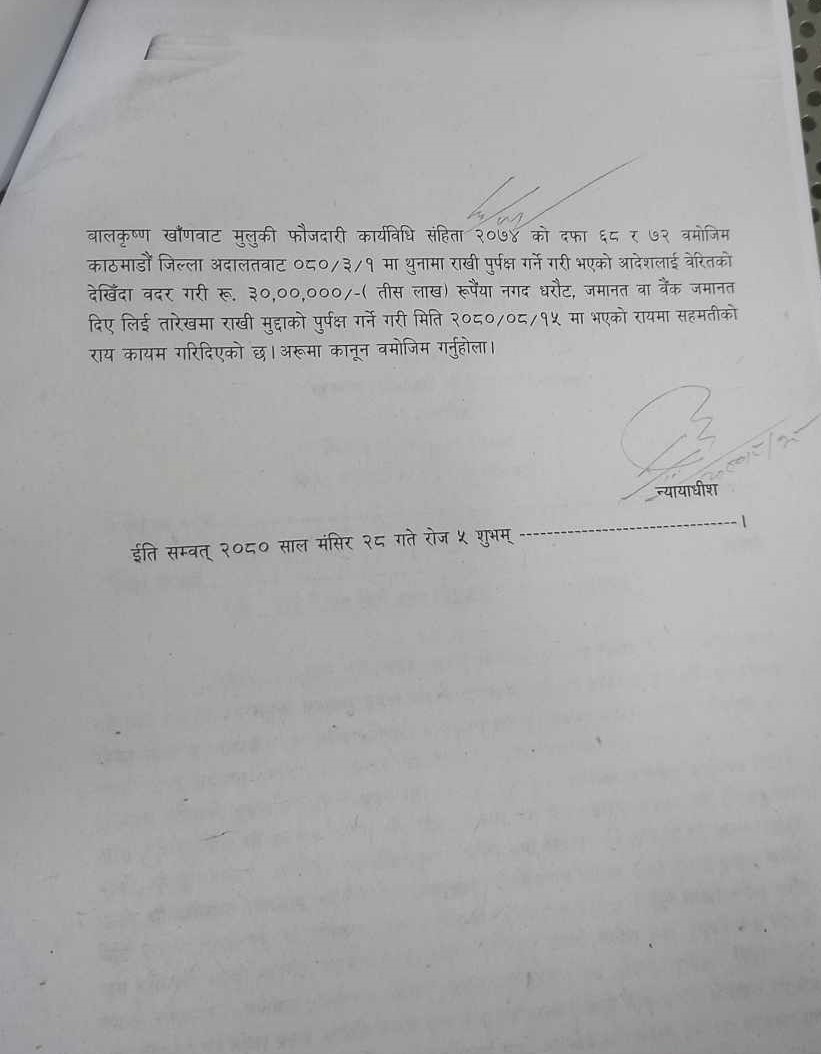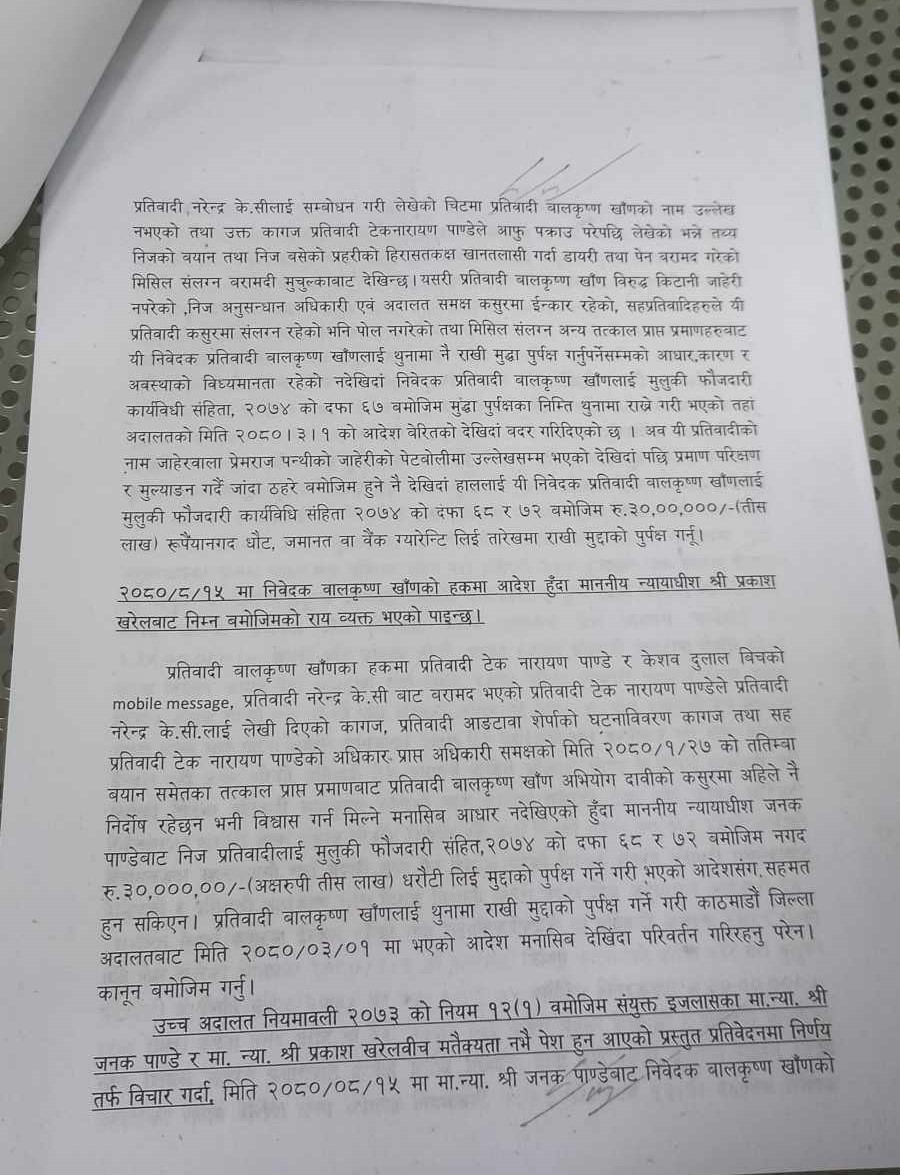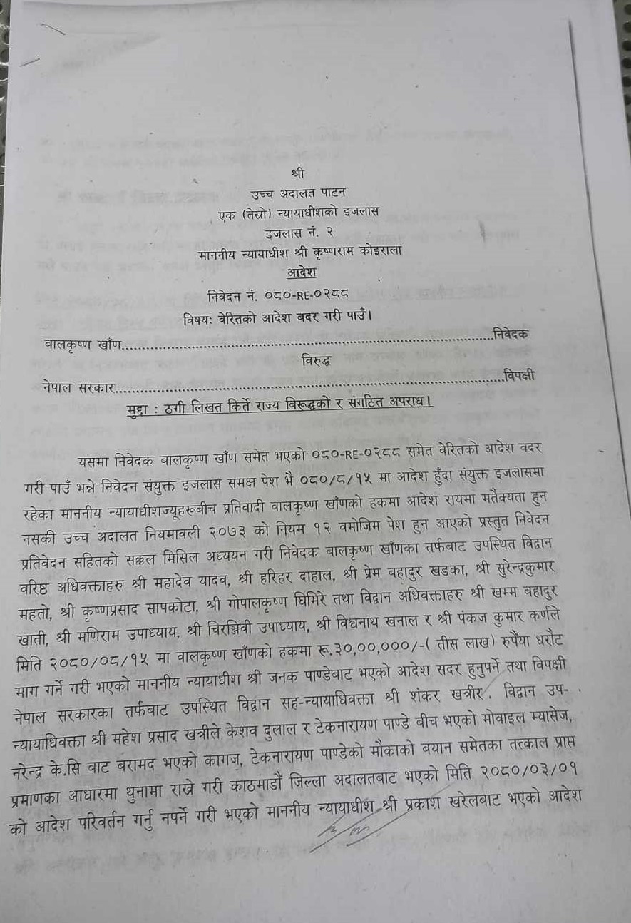 बालकृष्ण खाण ३० लाख धरौटीमा रिहा (आदेशसहित)
