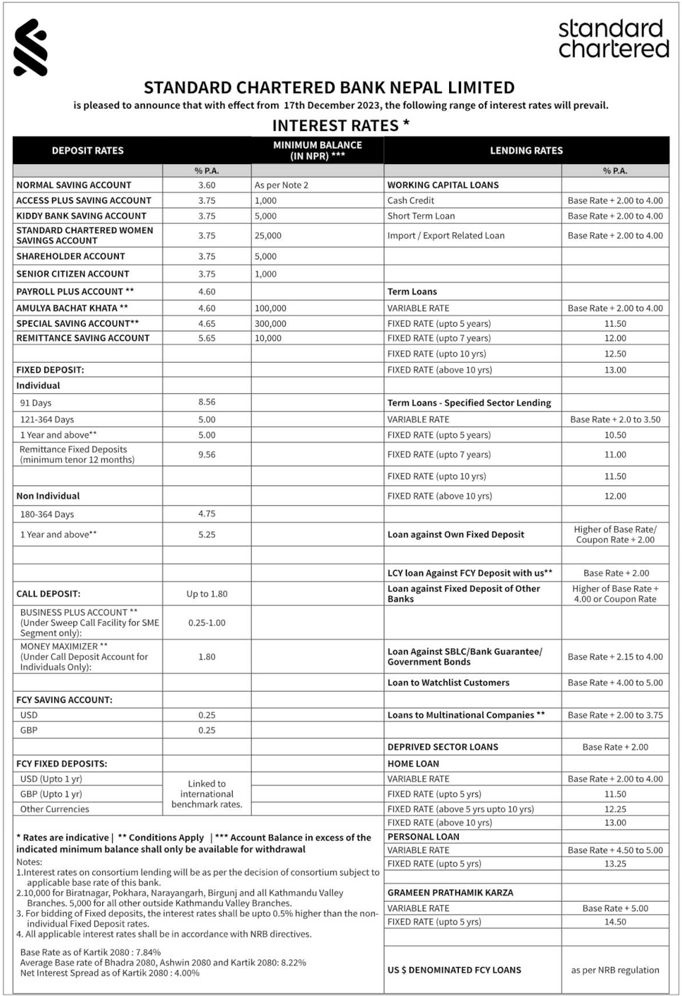 काठमाडौं । पछिल्लो समय वाणिज्यसहित विकास बैंकहरुले धमाधम ब्याजदर घटाएका छन् । यसैक्रममा स्ट्याण्डर्ड चार्टर्ड बैंकले पनि माघ १ गतेदेखि लागू हुने गरी ब्याजदर घटाएको छ ।