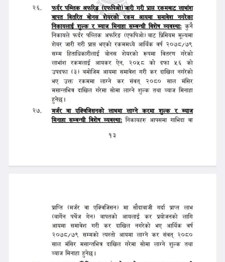बजेटमा उल्लेख भएको व्यवस्था अनुसार मर्जर तथा एफपिओमा कर निर्धारण भएका ११ वटा कम्पनीले पुरानो बक्यौता बमोजिमको मंसिर मसान्तभित्रैमा भुक्तानी गरेका जरिवना तथा ब्याज मिनाहाको व्यवस्था गरिएको छ । सो व्यवस्था अनुसार उनीहरुले आजै कर तिर्नुपर्ने भएको हो । भोलि शनिबार परेकोले आज शुक्रबारभित्रमा उक्त कर दायित्व नेपाल सरकारको खातामा जम्मा गरिसक्नुपर्नेछ । यदि तत्काल कर नतिरेमा जरिवना र ब्याज समेत गर्दा दोब्बर बढि हुन जान्छ ।