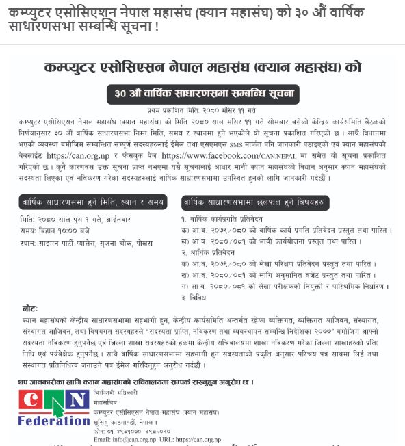 काठमाडौं । कम्प्युटर एसोसिएसन नेपाल महासंघ (क्यान महासंघ)को पहिलो प्रथम विधान महाधिवेशन तथा ३०औं वार्षिक साधारणसभा पोखरामा हुँदैछ । क्यान महासंघले दिएको जानकारी अनुसार मंसिर ३० अर्थात भोलिदेखि प्रथम विधान महाधिवेशन सुरु हुने र पर्सि पुस १ गते वार्षिक साधारणसभा हुने भएको छ ।