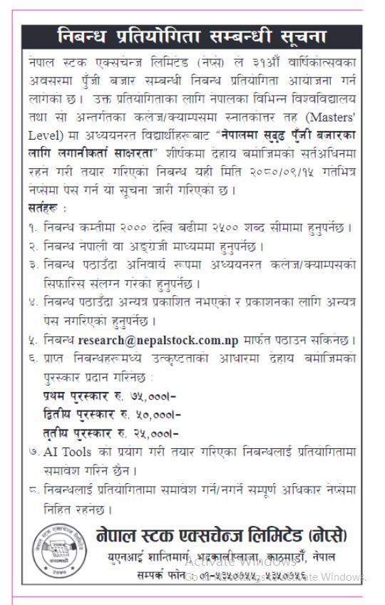 काठमाडौं । नेपाल स्टक एक्सचेन्ज लिमिडेट (नेप्से)ले आफ्ना ३१औं वार्षिकोत्सवका अवसरमा पुँजी बजार सम्बन्धी निबन्ध प्रतियोगिता आयोजना गर्ने भएको छ ।