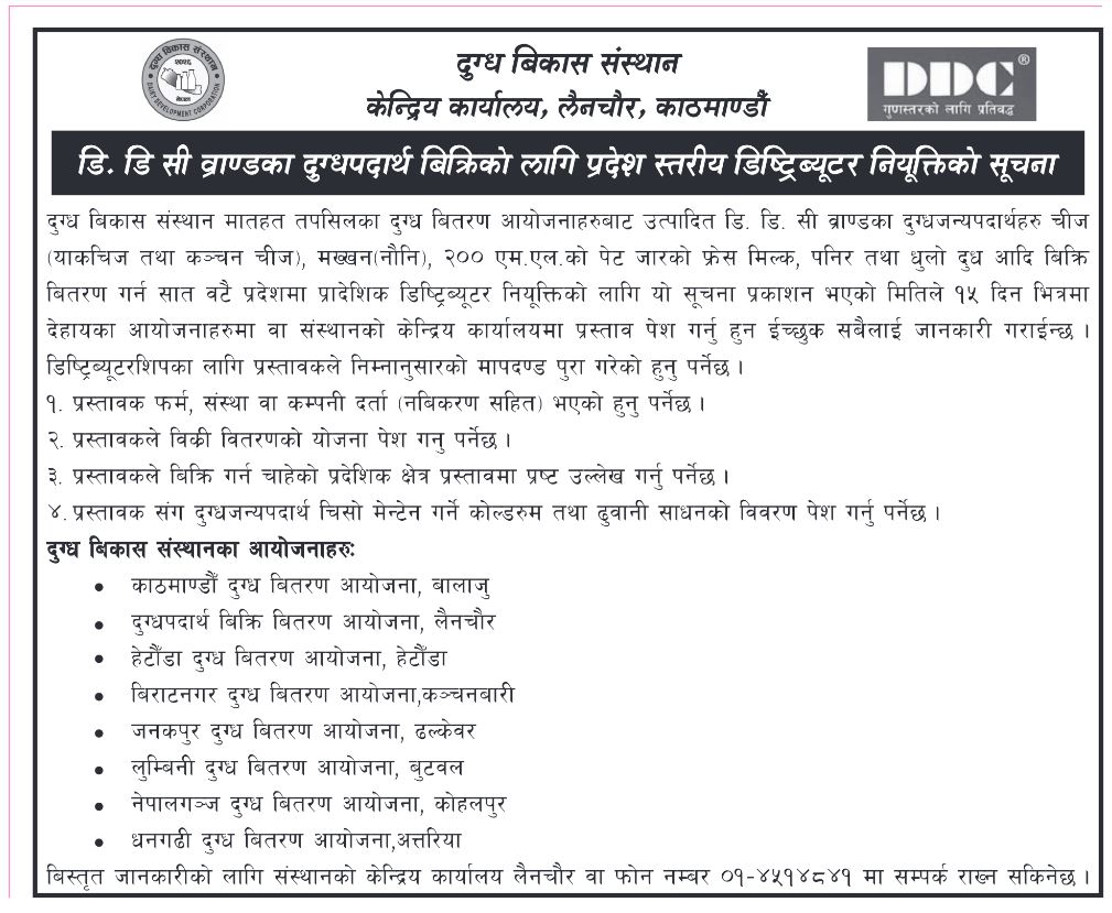 काठमाडौं । सरकारी स्वामित्वको दुग्ध विकास संस्थान केन्द्रीय कार्यालयले डीडीसी ब्राण्डका दुग्धपदार्थ बिक्रिको लागि सातवटै प्रदेशको विभिन्न ठाउँमा डिष्ट्रिव्यूटर नियुक्तिका लागि सूचना निकालेको छ ।