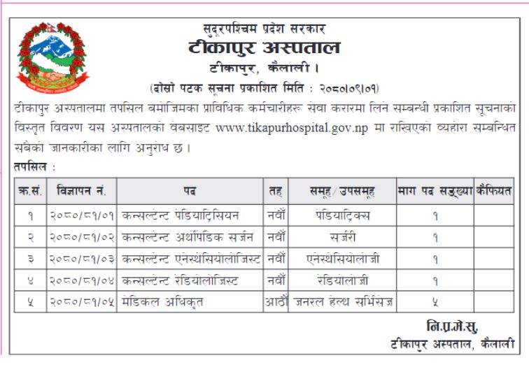 आठौं तहका मेडिकल अधिकृत मात्रै ५ जना मागेको टिकापुर अस्पतालले अस्पतालको वेबसाइटमा गएर समेत आवेदनबारे जानकारी लिन सकिने जनाएको छ ।