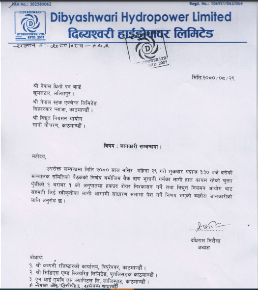 दिब्यश्वरी हाइड्रोपावरले हकप्रद शेयर निष्काशन गर्ने