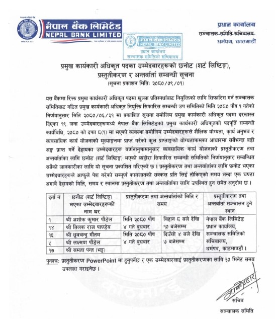 बैंकको सञ्चालक समितिको बैठकको निर्णयअनुसार उम्मेदवारहरूको शैक्षिक योग्यता, अनुभव, उल्लेखनीय कार्य तथा व्यवसायीक कार्ययोजनाको मूल्याङ्कन गरी वर्णानुक्रमअनुसार उक्त ५ उम्मेदवारहरू सर्ट लिष्टिङ्गमा छनौट भएका हुन् ।