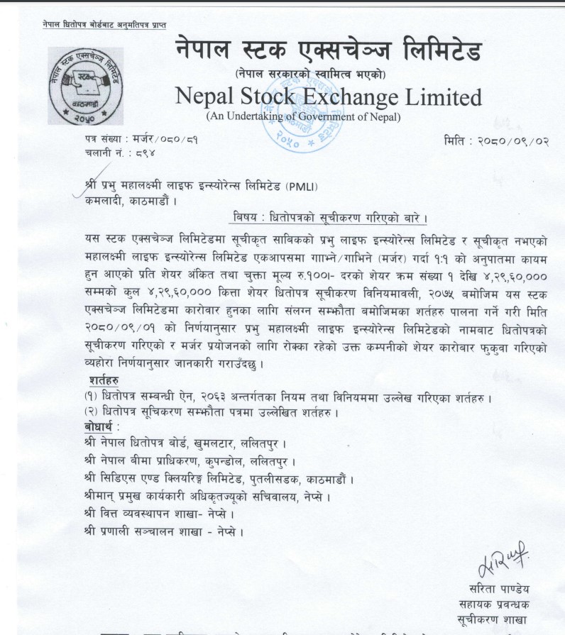 नेप्सेमा प्रभु महालक्ष्मी लाइफको नाममा १०० रुपैयाँ अंकित दरका कुल ४ करोड २९ लाख ६० हजार कित्ता शेयर सूचीकृत भएको छ। नेप्सेको आजको निर्णयबाट प्रभु महालक्ष्मी लाइफको नाममा धितोपत्र सूचीकरण भएको र मर्जर प्रयोजनका लागि रोक्का राखिएको शेयर कारोबार फुकुवा गरिएको हो।