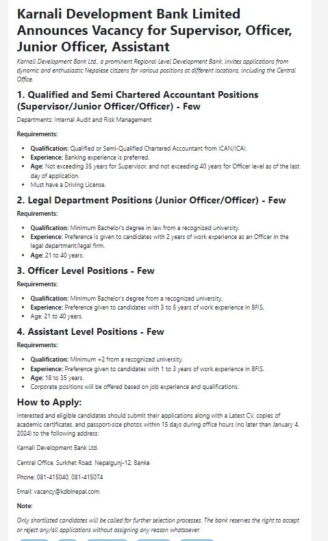 कर्णाली डेभलपमेन्ट बैंकले विभिन्न पदमा जागिर खोल्यो