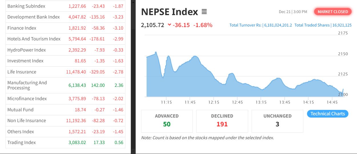 साताको अन्तिम कारोबार दिन उत्पादन तथा प्रशोधन र व्यापार उपसूचकबाहेक सबै उपसूचकहरु राताम्य भएका छन् । यस दिन उत्पादन तथा प्रशोधन उपसूचक १४२ अंकले बढ्दा व्यापार उपसूचक १७ अंकले बढ्यो । सबैभन्दा धेरै जीवन बीमा उपसमूहले नोक्सानी व्यहोर्नु परेको छ ।