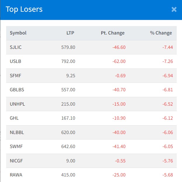 त्यस्तै, उन्नति सहकार्य लघुवित्त, सनराइज फस्ट म्युचुअल फण्ड, ग्रामिण विकास लघुवित्त, युनिअन हाइड्रोपावर लगायतका कम्पनीको शेयरमूल्य घटेको छ ।