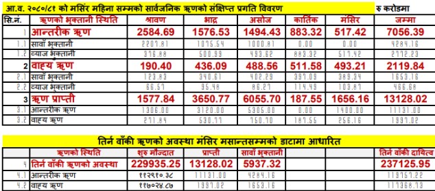 यसअघि कात्तिक महिनामा सरकारले तिर्नुपर्ने ऋण २३ खर्ब ५७ अर्ब ६ करोड ८७ लाख रुपैयाँ रहेको थियो ।मंसिर मसान्तसम्म तिर्न बाँकी कुल ऋणमध्ये ११ खर्ब ९७ अर्ब ५७ करोड २२ लाख रुपैयाँ आन्तरिक ऋण रहेको छ भने ११ खर्ब ७३ अर्ब ६८ करोड ७३ लाख रुपैयाँ बाह्य ऋण रहेको छ ।