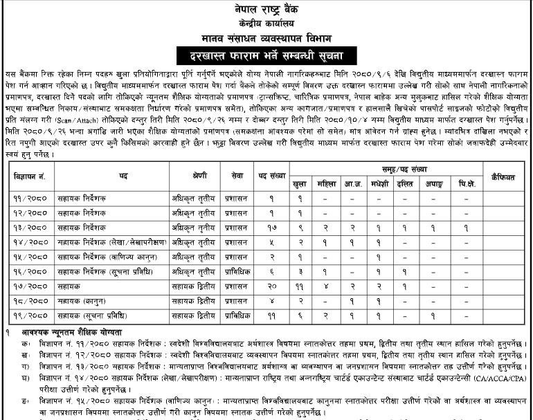 राष्ट्र बैंकले प्रशासन, लेखा, लेखापरीक्षण, वाणिज्य कानून र सूचना प्रविधि सेवाका लागि खुला र समावेशी गरेर ६७ जनाको दरखास्त खोलेको हो ।