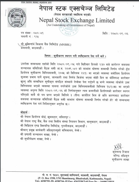 काठमाडौं । नेपाल स्टक एक्सचेन्ज (नेप्से) ले मुक्तिनाथ विकास बैंकको सूचीकरण स्थगित गरेको छ । कारोबार समयमै सञ्चालक समितिको बैठक बसी लाभांश प्रस्ताव गरेपछि नेप्सेले बैंकको सुचीकरण स्थगित गरेको हो ।