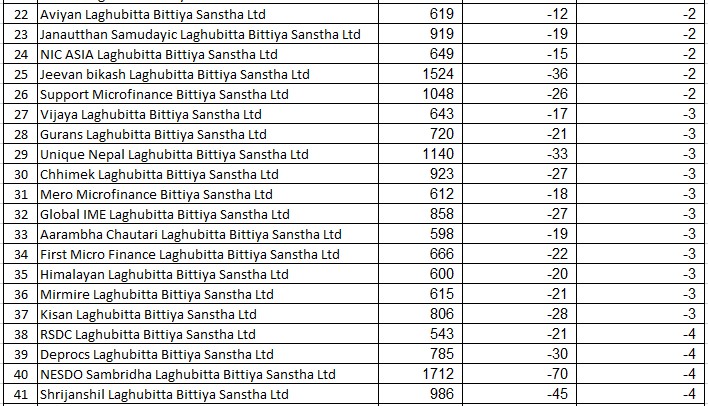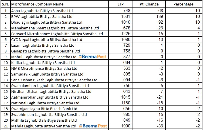 बिहीबार कारोबार भएका लघुवित्त कम्पनीहरुमध्ये ८ कम्पनीको शेयरमूल्य बढेको छ । त्यस्तै, ४५ कम्पनीको शेयरमूल्य घटेको छ र २ कम्पनीको सोही मूल्यमा कारोबार भएको छ ।