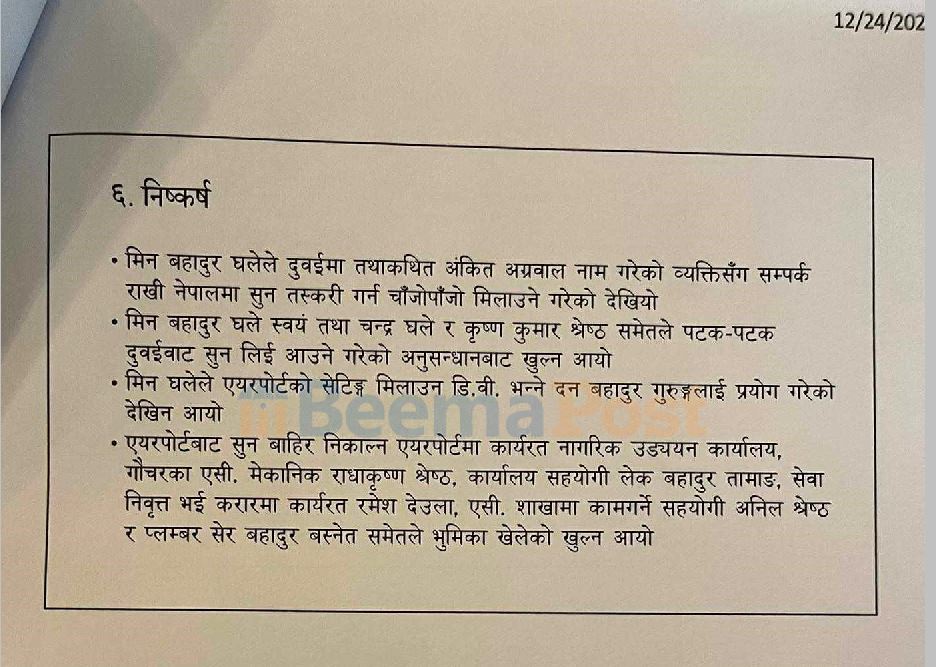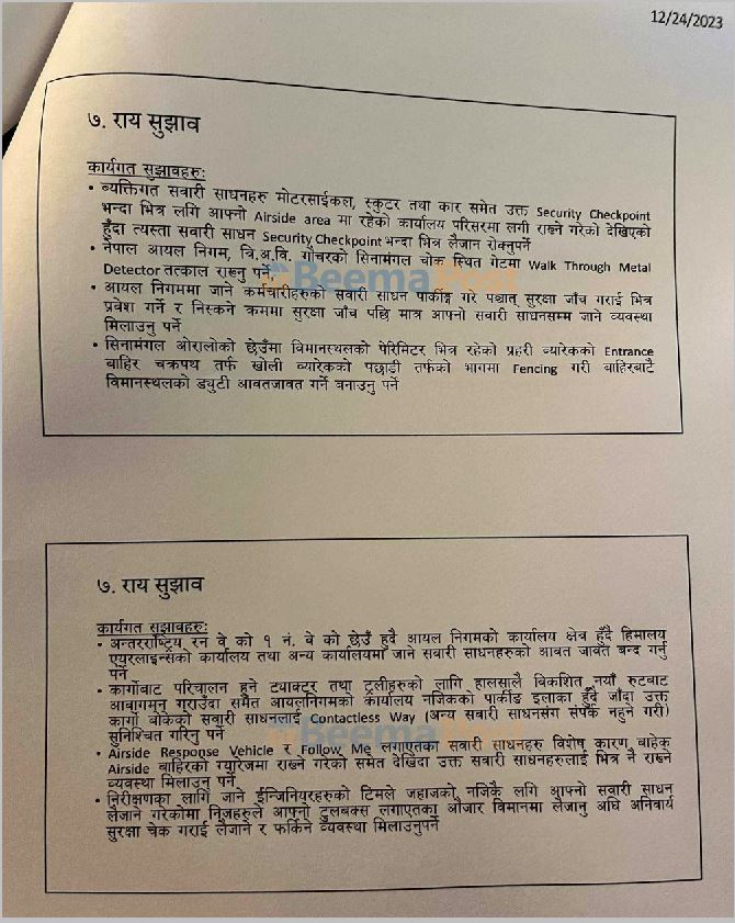 आयल निगम र विमानस्थल गौचरको सिनामंगल चोकस्थित गेटमा वाक थ्रु मेटल डिटेक्टर तल्लकाल राख्नुपर्ने, आयल निगममा जाने कर्मचारीहरुको सवारी साधन पार्किङपछि सुरक्षा जाँच गराइभित्र प्रवेश गर्ने र निस्कने क्रममा सुरक्षा जाँचपछि मात्रै आफ्नो सवारी साधनसम्म जाने व्यवस्था गर्ने, सिनामंगल ओरालो छेउमा रहेको प्रहरी व्यारेकमा प्रवेश गर्ने बाटो चक्रपथबाट खोलेर पछाडितिरको भागमा फिनिसिङ पर्खाल लगाउनुपर्ने सुझाव समेत समितिले दिएको छ । विमानस्थलभित्रको भद्रगोलबारे बीमापोष्टबाट निरन्तर प्रकाशित समाचारले औंल्याएका अधिकांश तथ्यहरु प्रतिवेदनले समेटेको छ ।