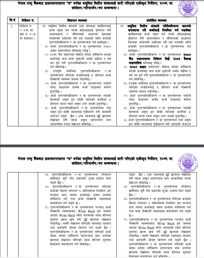 एकीकृत निर्देशनमा उल्लेखित २०७९ चैत मसान्तमा सक्रिय वर्गमा वर्गीकरण भएको कर्जालाई मात्र कर्जा भुक्तानी अवधि बढीमा १ वर्ष थप हुने गरी पुनर्तालिकीकरण वा पुनर्संंरचना गर्न सकिने भन्ने व्यवस्थालाई संशोधन गर्दै राष्ट्र बैंकले ‘यस्तो पुनर्तालिकीकरण वा पुनर्संरचना २०८० असार मसान्तसम्म सक्रिय वर्गमा वर्गीकरण भएको कर्जालाई मात्र भक्तानी अवधि बढीमा १ वर्ष थप हुने’ भनी संशोधित निर्देशन जारी गरेको छ ।