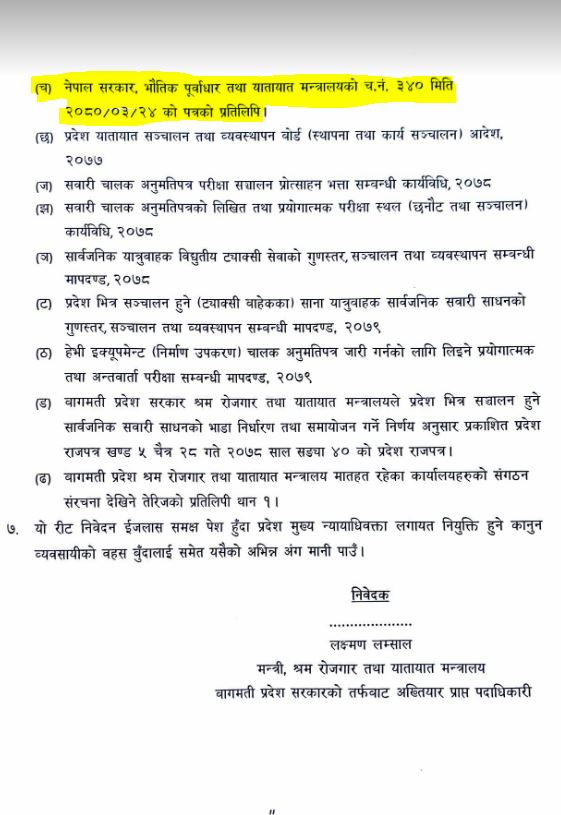 प्रदेश यातायातमन्त्री लक्ष्मण लम्सालले सर्वोच्चमा हालेको रिटले समेत यसको थप पुष्टि गरेको छ । मन्त्री लम्सालले संघीय मन्त्रालयलले २०८० असार २४ गते निर्देशिका कार्यान्वयनका लागि पठाएको पत्रको प्रतिलिपि समेत सर्वोच्चमा पेश गरेका छन् । जहाँ उनले संघीय संसदबाट जारी भएको ‘शहरी क्षेत्र सार्वजनिक यातायात (व्यवस्थापन) प्राधिकरण ऐन २०७९’को व्यवस्था खारेजीको माग गरेका छन् ।