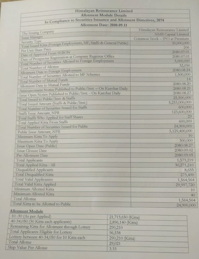 हिमालयन रिइन्स्योरेन्सको आईपीओ बाँडफाँड सम्पन्न, ३० कित्तासम्म आवेदन दिने सबैले पाए शेयर