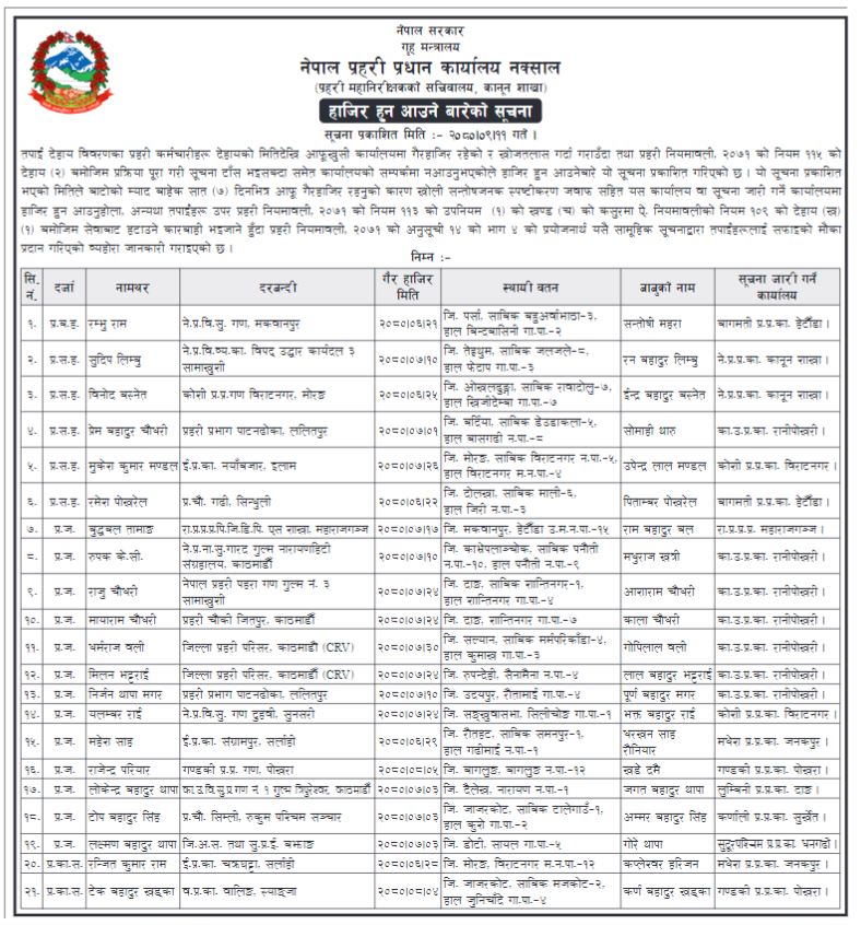 सम्पर्कविहीन २१ जना प्रहरीलाई ७ दिनभित्र हाजिर हुन प्रहरी हेडक्वार्टरको निर्देशन, नत्र जागिर जाने (सूचीसहित)