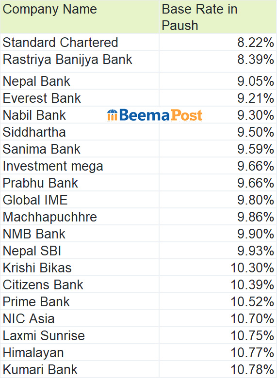 पुस महिनाको लागि १३ वटा वाणिज्य बैंकको आधार दर एकल अंकमा रहेको छ । यस अवधिमा सबैभन्दा थोरै ब्याजदरमा कर्जा दिने बैंक स्ट्याण्डर्ड चार्टर्ड बैंक रहेको छ । उक्त बैंकले आफ्ना ग्राहकलाई ८.२२ प्रतिशत बेसरेटमा केही प्रतिशत प्रिमियम थप गरेर कर्जा लगानी गर्दै आएको छ । यसैगरी, सबैभन्दा कम बेसरेट भएको दोस्रो बैंक राष्ट्रिय वाणिज्य बैंक रहेको छ । यस बैंकले आफ्ना ग्राहकलजाई ८.३९ प्रतिशत बेसरेटमा ब्याज दिने गरेको छ ।