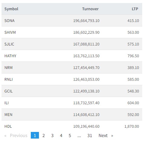 त्यस्तै, शिवम सिमेन्टस, सूर्यज्योति लाइफ, हाथवे इन्भेष्टमेन्ट, नेपाल रिपब्लिका, घोराही सिमेन्टस, आइएमई लाइफ, माउन्टेन इनर्जी र हिलमायन डिष्टलरीको सर्वाधिक कारोबार भएको छ ।