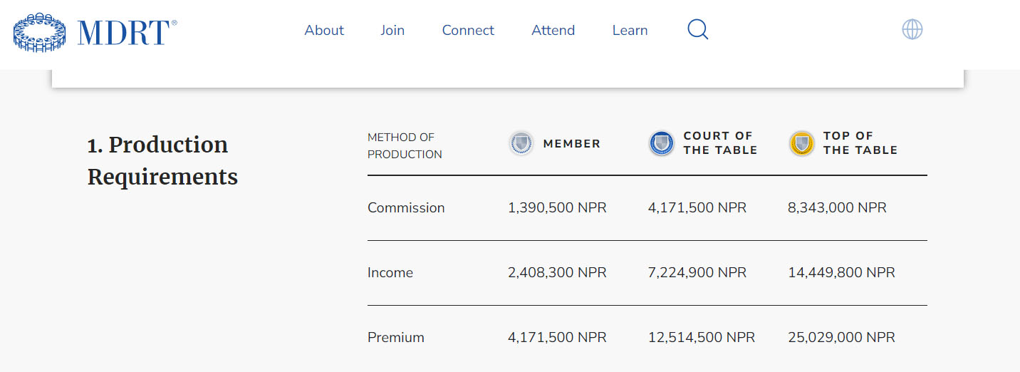 सो व्यवस्था अनुसार एमडिआरटी २०२४ को लागि लक्ष्य पुरा गर्ने आज अन्तिम दिन हो । एमडिआरटीको सदस्य बन्न आजसम्म ४१ लाख ७१ हजार ५०० रुपैयाँ प्रिमियम जम्मा गर्नसक्नुपर्नेछ ।