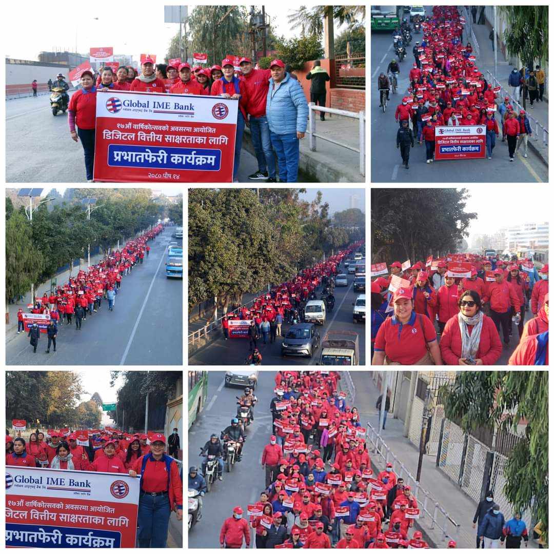 यही पौष १७ गतेदेखि ग्लोबल आइएमई बैंक आफ्नो स्थापनाको १६ वर्ष पुरा भई १७औं वर्षमा प्रवेश गर्दैछ । काठमाडौंमा आयोजित प्रभातफेरीमा नेपाल उद्योग वाणिज्य महासंघका अध्यक्ष तथा ग्लोबल आइएमई बैंकका अध्यक्ष चन्द्रप्रसाद ढकाल, बैंक सञ्चालक समिति सदस्यहरू, बैंक उच्च व्यवस्थापनसहित १५ सयभन्दा बढी कर्मचारीहरूको उपस्थिति थियो ।