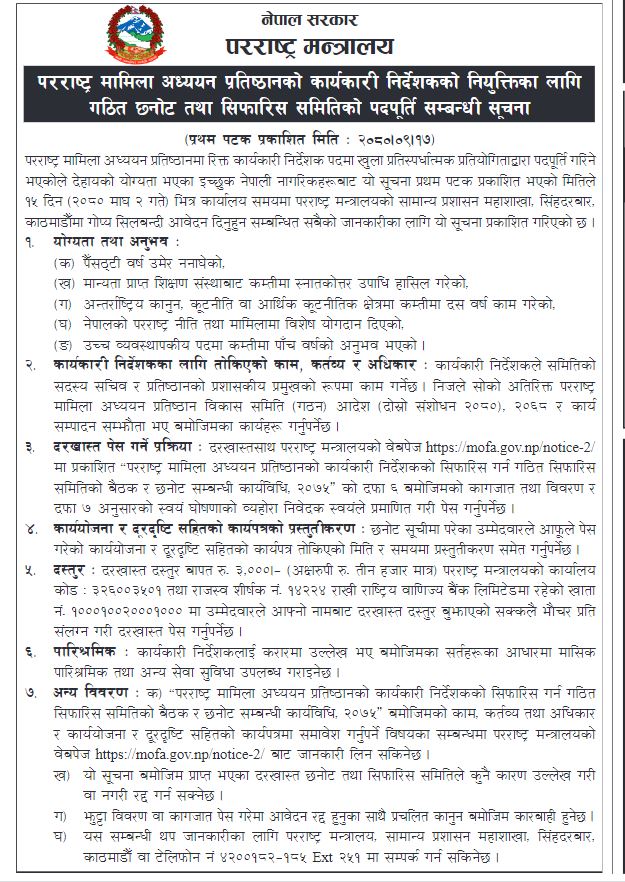 परराष्ट्र मामिला अध्ययन प्रतिष्ठानको कार्यकारी निर्देशकका लागि खुल्ला विज्ञापन आह्वान (सूचनासहित)