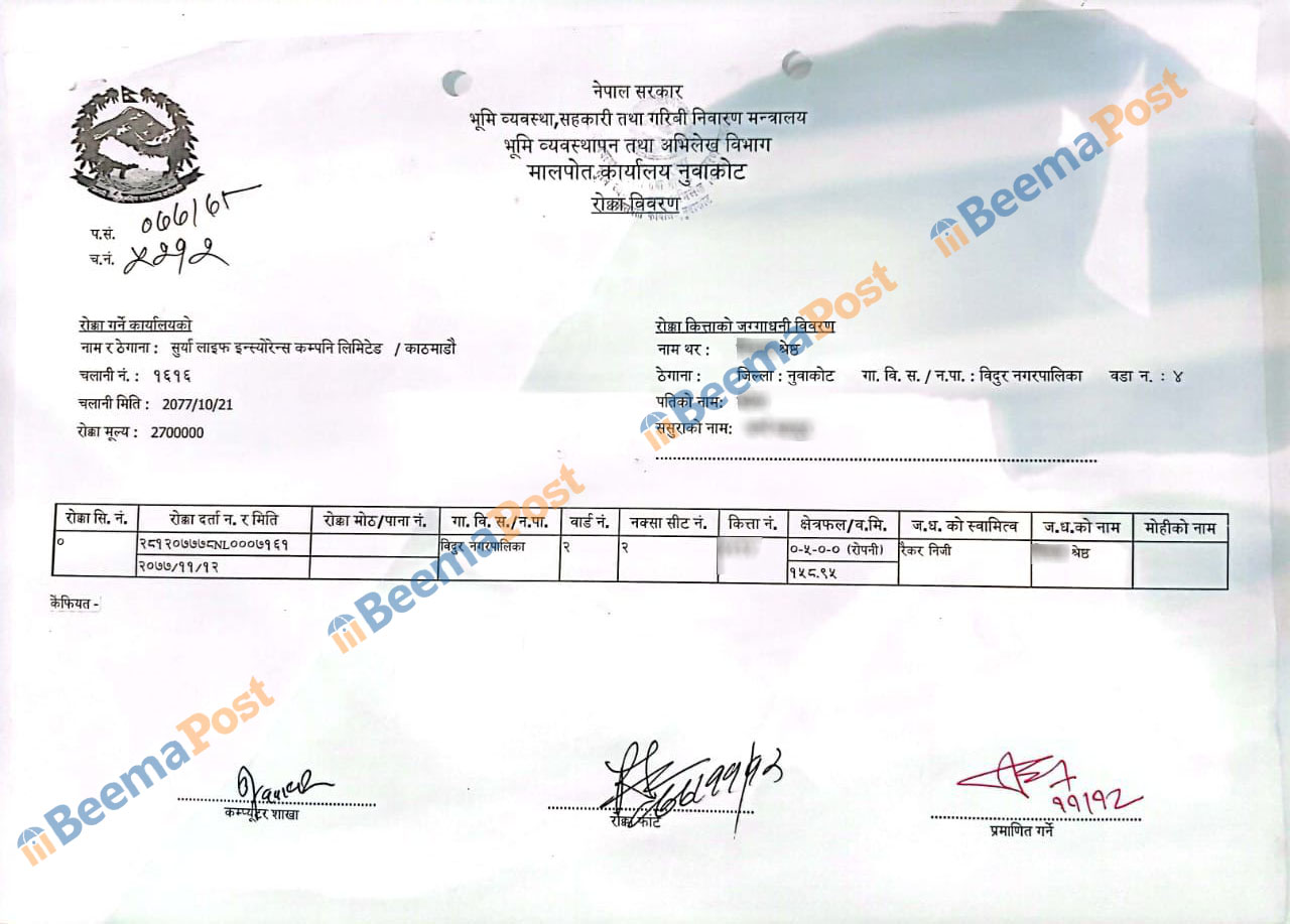 मालपोत कार्यालय नुवाकोटबाट प्राप्त कागजातमा तत्कालिन सुर्या लाइफ इन्स्योरेन्स कम्पनीले २०७७ माघ २१ गते चलानी नं १६१६ बाट मालपोत कार्यालय नुवाकोटलाई पत्र लेखेरै नुवाकोट जिल्ला बिदुर नगरपालिका ४ का २२ बर्षिय श्रेष्ठ थरका ऋणीको आमाको नामको जग्गा रोक्का राखेको भेटिएको छ ।