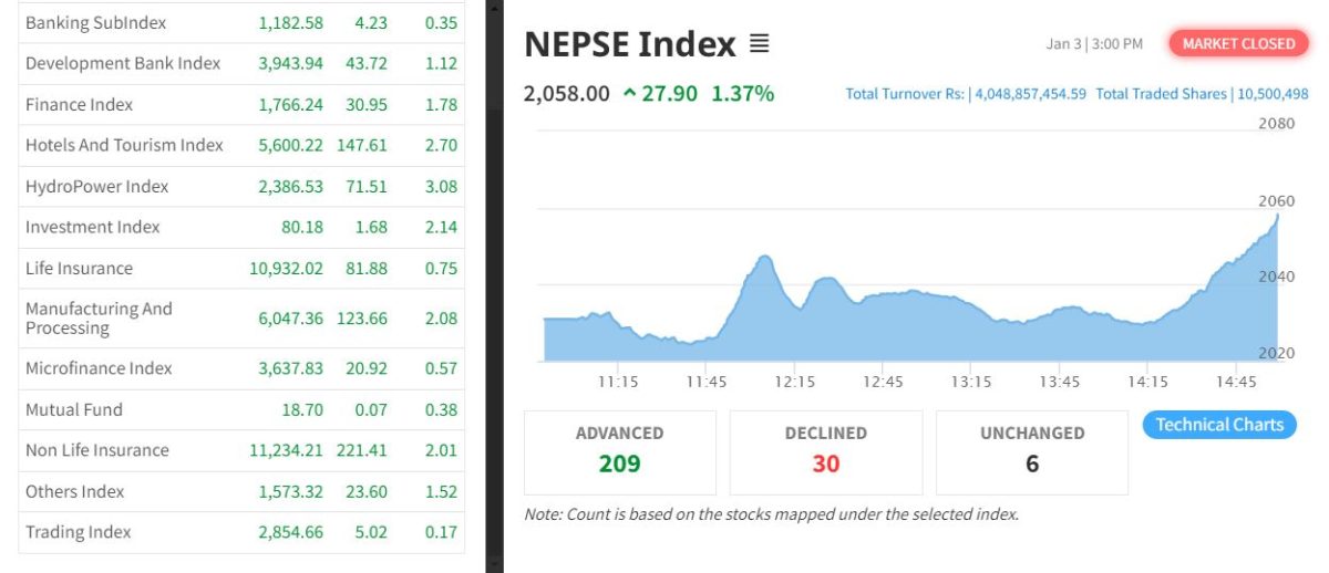 विकास बैंक, जीवन बीमा, हाइड्रो पावर, लघुबित्त र अन्य उपसूचक दोहोरो अंकले बढ्दा बैंक, व्यापार, लगानी उपसूचक एकल अंकमा वृद्धि भएका छन् ।