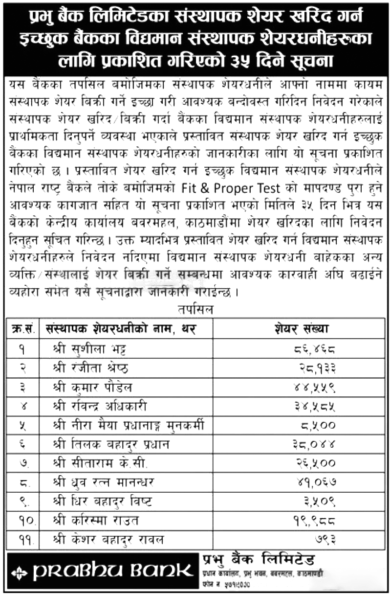 काठमाडौं । प्रभु बैंकको ११ संस्थापक शेयरधनी एकैपटक बाहिरिने भएका छन् । उनीहरुले आफ्नो नाममा रहेको ३ लाख ३२ हजार १४६ कित्ता संस्थापक शेयर बिक्री गरी बाहिरिन लागेका हुन् ।