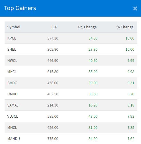 त्यस्तै, आज बिन्ध्यबासिनी हाइड्रोपावर, यूनाईटेड आईडीआईडी मार्दी आरबी हाइड्रोपावर, समाज लघुवित्त, भिजन लुम्बिनी उर्जा, मोलुङ्ग हाइड्रोपावर र माण्डु हाइड्रोपावरको शेयरमूल्य सर्वाधिक बढेको छ ।