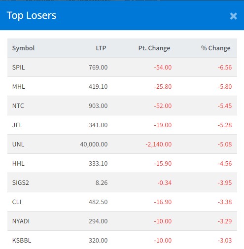 त्यसैगरी, जानकी फाइनान्स, यूनिलिभर नेपाल, हिमालयन हाइड्रोपावर, सिद्धार्थ इन्भेष्टमेन्ट ग्रोथ स्किम–२, सिटिजन लाइफ, न्यादी हाइड्रोपावर र कामना सेवा विकास बैंकको शेयरमूल्य अत्यधिक घटेको छ ।