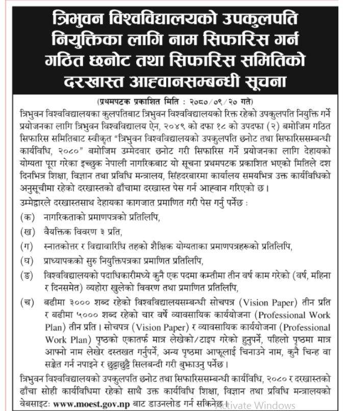 उम्मेदवारले १० दिनभित्र शिक्षा, विज्ञान तथा प्रविधि मन्त्रालय, सिंहदरबारमा कार्यालय समयभित्र दरखास्त पेश गर्न भनिएको छ । उपकुलपतिका लागि दरखास्त दिनेले बढीमा ३००० शब्द लेखिएको विश्वविद्यालयसम्बन्धी भिजन पेपर, बढीमा ५००० शब् द रहेको चार वर्षे व्यवसायिक कार्ययोजना प्रोफेस्नल प्लान बनाएर कार्यविधि अनुरुप दरखास्त बुझाउनु पर्ने छ ।