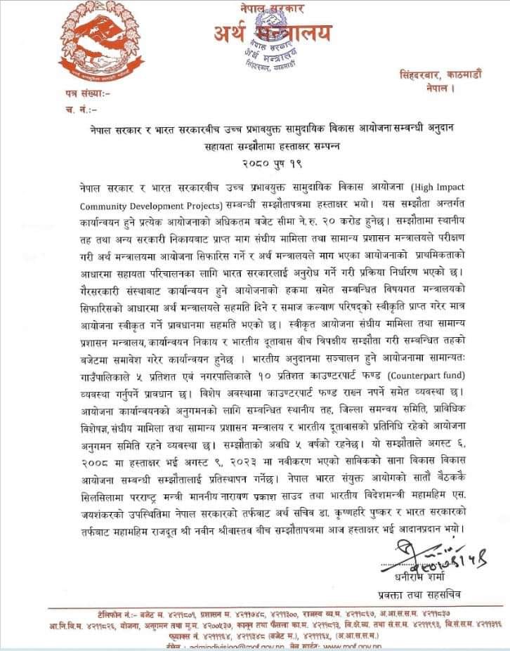 प्रधानमन्त्री प्रचण्डले प्रष्टिकरण दिनु पहिले अर्थ मन्त्रालयले भारतसँग गरेको सम्झौताको पहिलो पेज सार्वजनिक गरेको थियो । जसमा स्थानीय तह तथा अन्य सरकारी निकायबाट प्राप्त माग र संघीय मामिला तथा सामान्य प्रशासन मन्त्रालयले परीक्षण गरी अर्थ मन्त्रालयमा आयोजना सिफारिस गर्ने र अर्थ मन्त्रालयको माग भएका आयोजनाको प्राथमिकताको आधारमा सहायता परिचालनका लागि भारत सरकारलाई अनुरो गर्ने गरी प्रक्रिया निर्धारण गरिएको भन्दै घुमाउरो भाषा प्रयोग गरिएको छ ।