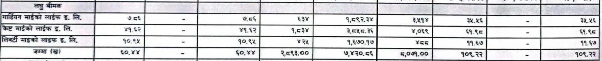 यस्तै, मंसिर महिनामा मात्रै उनीहरुले ६० लाख कुल बीमाशुल्क आर्जन गरेका छन् । मंसिर महिनामा क्रेष्ट माइक्रो लाफले ४१ लाख कुल बीमाशुल्क आर्जन गर्दा लिवर्टीले १० लाख कुल बीमाशुल्क आर्जन गरेको छ । गार्डियन माइक्रो लाफले भने मंसिर महिनामा ७ लाख रुपैयाँ कुल बीमाशुल्क आर्जन गरेको छ ।