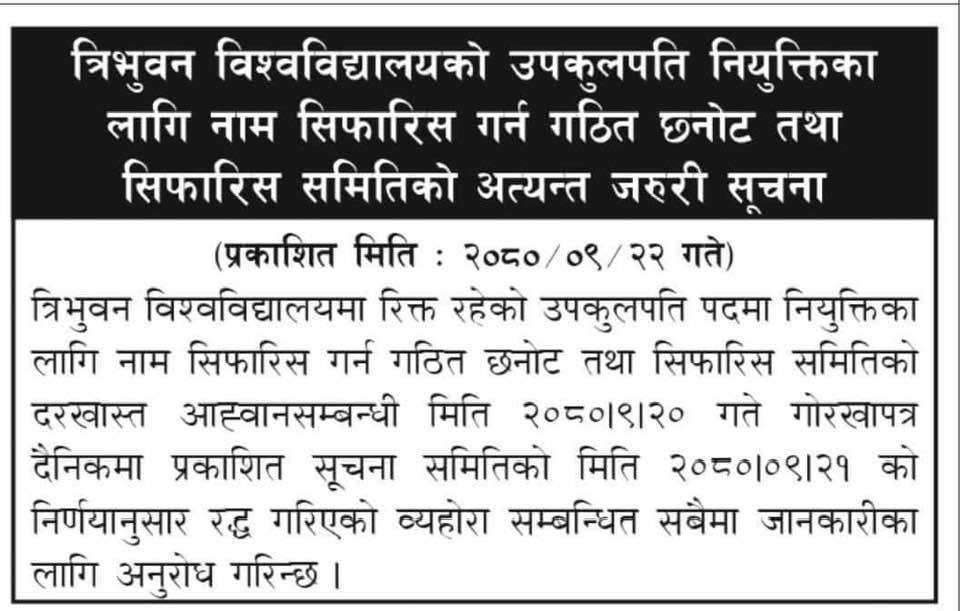पुस २० गते शुक्रबार सूचना जारी गरेर उपकुलपतिका लागि दरखास्त आह्वान गरेको थियो । सूचनामा उल्लेख गरिएको प्रावधानबारे विवाद भएपछि रद्द गरिएको अर्को सूचना निकालिएको छ ।