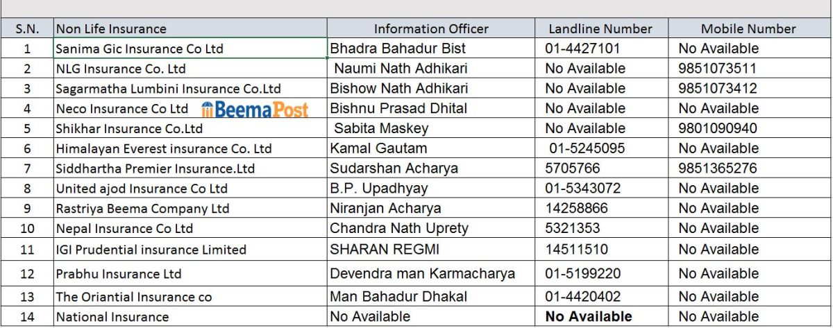 हाल नेपालमा १४ वटा जीवन बीमा कम्पनी र १४ वटा निर्जीवन बीमा कम्पनी गरी कुल २८ वटा कम्पनीहरु सञ्चालनमा छन् । सम्पूर्ण कम्पनीले बीमा प्राधिकरणको नियम अनुसार सूचना अधिकारी नियुक्त गरेका छन् । तर, एकाध कम्पनी बाहेक कसैले पनि सूचना अधिकारीको मोबाइल नम्बर आफ्नो वेबसाइटमा राखेका छैनन् ।