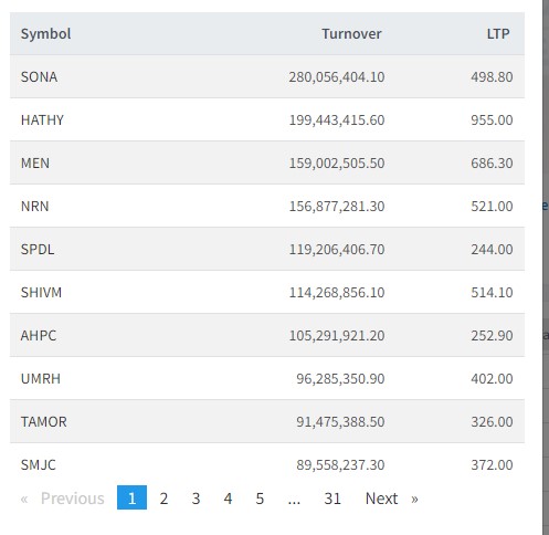 त्यस्तै, माउन्टेन इनर्जी, एनआरएन इन्फ्रास्टक्चर, सिनर्जी पावर, शिवम सिमेन्टस, अरुण भ्याली, युनाईटेड इर्दी, तमोर र सगरमाथा जलविधुत्को सर्वाधिक कारोबार भएको छ।