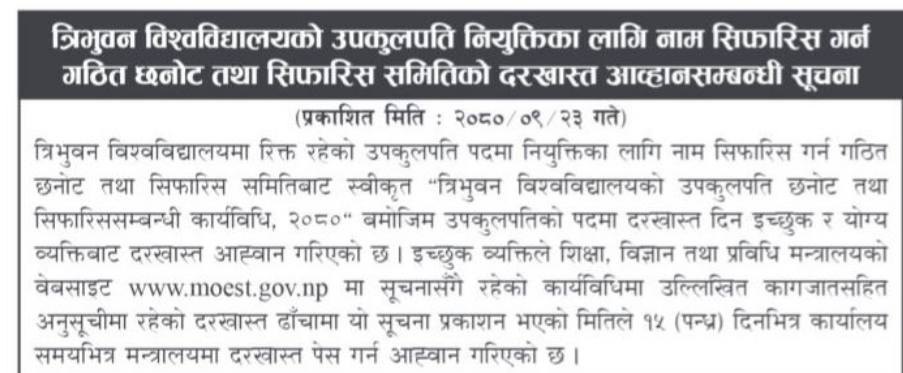 जारी सूचनामा समितिले इच्छुक व्यक्तिले शिक्षा, विज्ञान तथा प्रविधि मन्त्रालयको वेबसाइटमा सूचनासँगै रहेको कार्यविधिमा उल्लिखित कागजातसहित अनुसूचीमा रहेको दरखास्त ढाँचामा १५ दिनभित्र आवेदन दिन भनेको छ ।