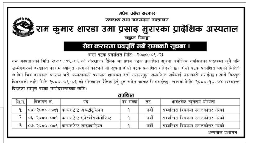 सिरहाको लहानस्थित प्रादेशि अस्पतालले कन्सलटेन्ट डाक्टर मागेको यो दोस्रो पल्ट हो । यसअघि पुस ६ गते पहिलो पटक सूचना प्रकाशित गर्दा कन्सलटेन्ट अव्स्टेट्रिसियन, कन्सलटेन्ट एनेस्थेसियोलोजिष्ट र कन्सलटेन्ट साइक्याट्रिक्समा कुनै पनि दरखास्त फारम स्वीकृत नभएका कारण दोस्रो पटक सूचना प्रकाशित गरिएको बताइएको छ ।