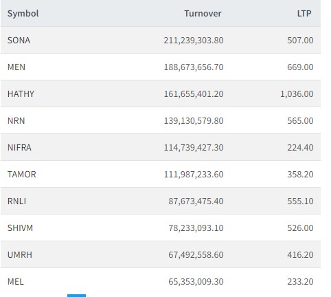 त्यस्तै, हाथवे, एनआरएन इन्फ्रास्टचर, निफ्रा, सानिमा मिडल तमोर, रिलायबल नेपाल लाइफ, शिवम सिमेन्टस, मोदी इनर्जी र युनाईटेढ इर्दी मर्दीको सर्वाधिक कारोबार भएको छ।