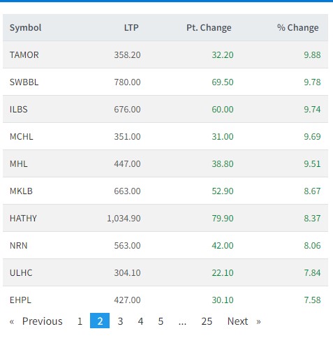 आज सिंगटी, मोदी इनर्जी, त्रिशुली जलविधुत्, मुक्तिनाथ कृषि, नेपाल वेयर हाउस र हिमालयन रि इन्स्योरेन्स, तेह्रथुम पावर, समाज लघुवित्त, सामलिङ्ग पावर, समानिमा मिडल तमोर, स्वमाभलम्बन लघुवित्त,इन्फिनिटिभ लघुवित्त, मञ्छिया, मन्दाकिनि हाईड्रोपावर र कालिका पावरको शेयर ९ प्रतिशतमाथि वृद्धि भएको छ।