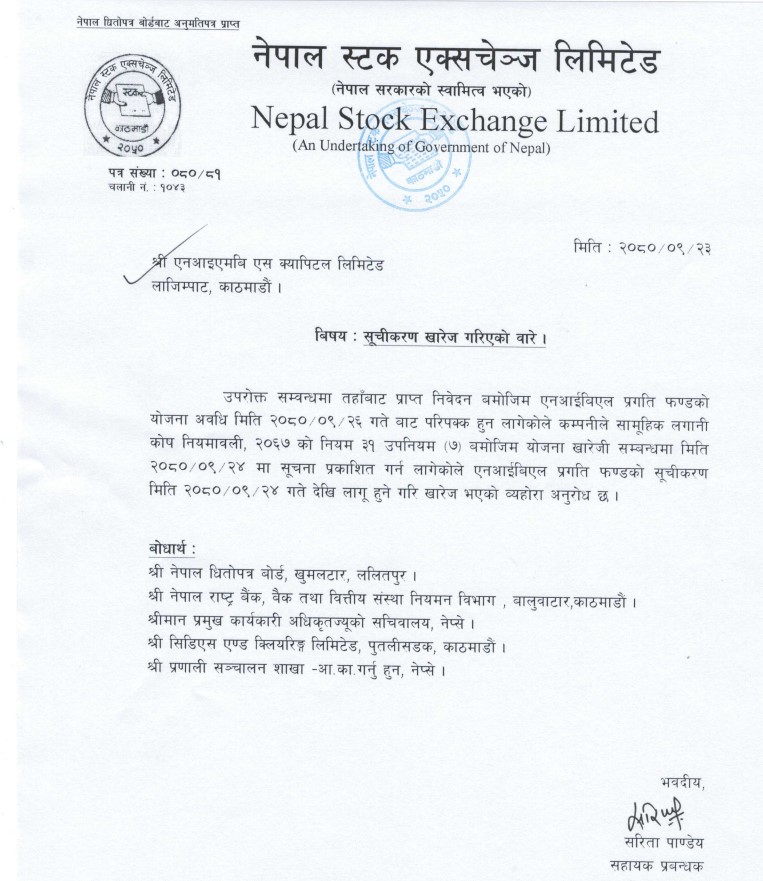 एनआईबिएल प्रगति फन्डको सूचीकरण खारेज भएको छ । योजनाको अवधि परिपक्क भएसँगै नेप्सेले २०८० पुस २४ गतेदेखि लागू हुने गरि फन्डको इकाईको दोस्रो कारोबार बन्द गरेको हो ।