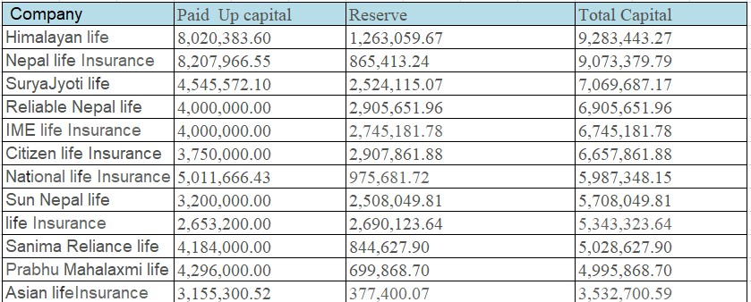 चालु आर्थिक वर्षको पहिलो त्रैमासको वित्तीय विवरण अनुसार हिमालयन लाइफ इन्स्यारेन्सको चुक्ता पुँजी ८ अर्ब २ करोड ३ लाख रुपैयाँ छ भने नेपाल लाइफ इन्स्योरेन्सको चुक्ता पुँजी ८ अर्ब २० करोड ७९ लाख रुपैयाँ पुगेको छ । त्यस्तै नेसनल लाइफ इन्स्योरेन्सको चुक्ता पुँजी ५ अर्ब १ करोड १६ लाख रुपैयाँ पुगेको छ । हिमालयन लाइफ इन्स्योरेन्समा प्राइम लाइफ, गुराँस लाइफ र युनियन लाइफ गरी तीन वटा लाइफ इन्स्योरेन्स कम्पनी मर्जर भएर बनेको कम्पनी हो भने नेपाल लाइफ र नेसनल लाइफले भने बोनस शेयर नै जारी गरेर चुक्ता पुँजी ५ अर्ब भन्दा माथि पुर्याएको हो ।