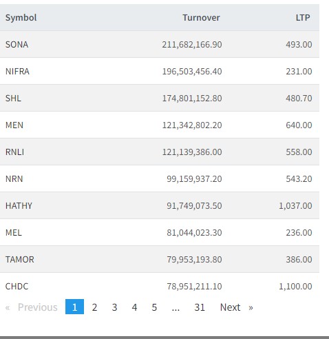 त्यस्तै, , सोल्टि होटल, रिलायबल नेपाल लाइफ, माउन्टेन इनर्जी, एनआरएन इन्फ्रास्टक्चर, हाथवे,मोदी इनर्जी, सानिमा मिडिल तमोर र सिईडिबीको सर्वाधिक कारोबार भएको छ ।