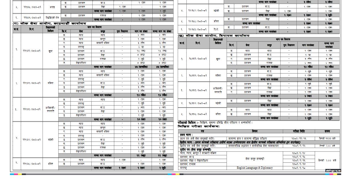काठमाडौं । लोक सेवा आयोगले देशका विभिन्न कार्यालयबाट एकै साथ निजामती सेवाका राजपत्र अनंकित प्रथम श्रेणी (अप्राविधिक) तथा राष्ट्रिय मानव अधिकार सेवाका सहायक प्रथम श्रेणीका पदको खुला र समावेशी प्रतियोगितात्मक लिखित परीक्षको दरखास्त खोलेको छ ।
