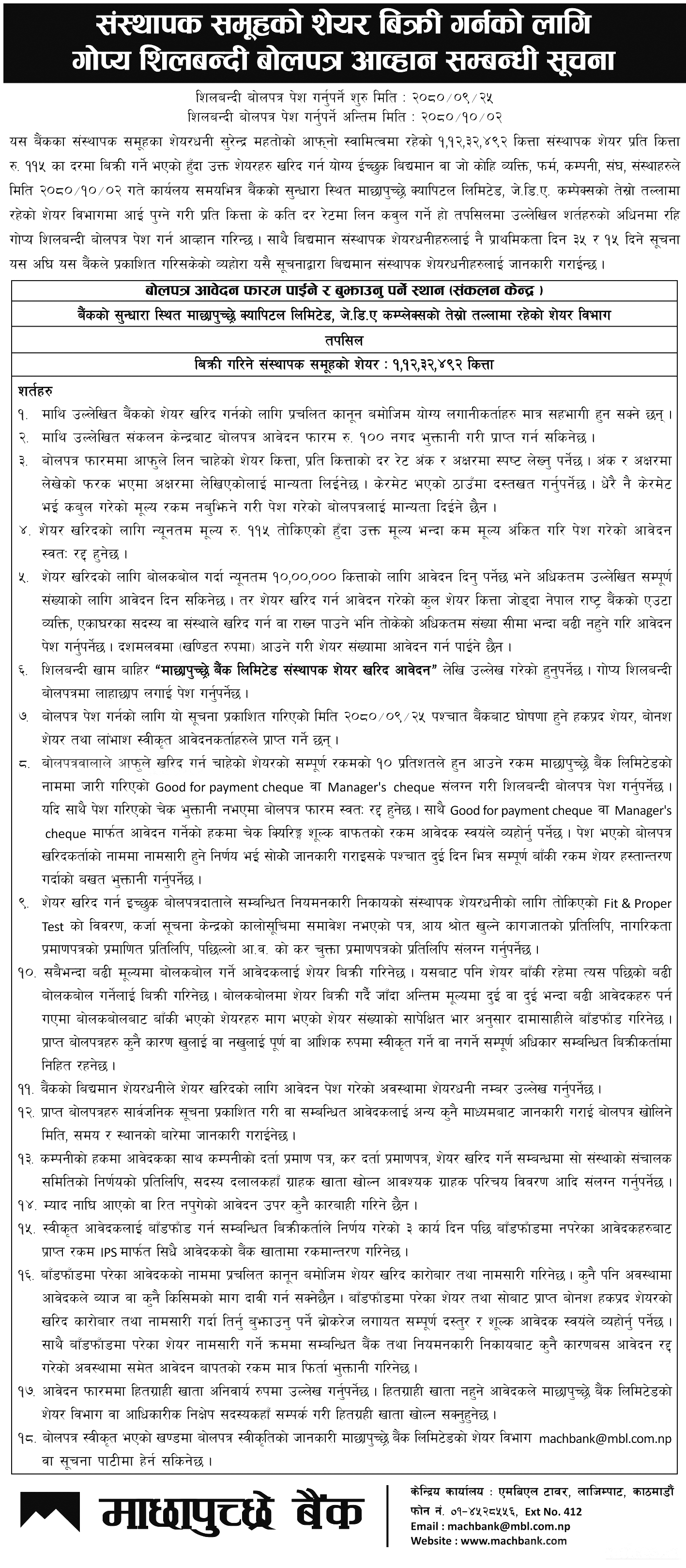 माछापुच्छ्रे बैंकको १.१२ करोड कित्ता संस्थापक शेयर बिक्रीमा, न्यूनतम मूल्य कति?