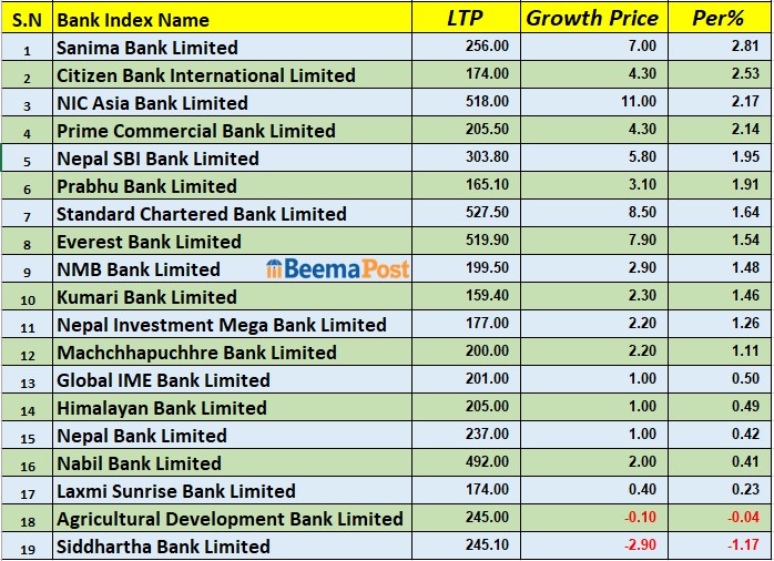 नेप्से सामान्य अंकले बढ्दा बाणिज्य बैंकमा उछाल, कुनको शेयरमूल्य कति? (एलटीपीसहित)