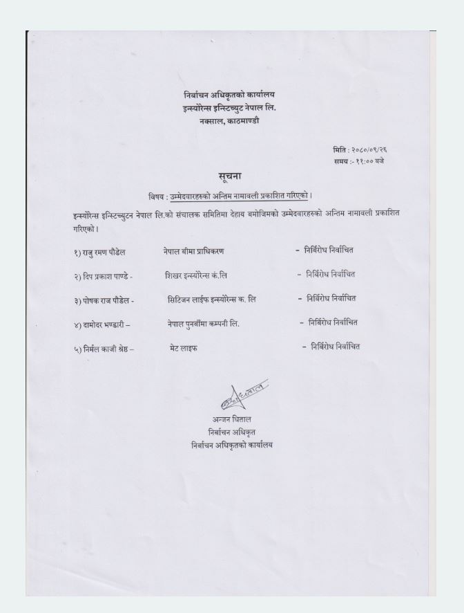 उम्मेदवारहरुको अन्तिम नामावलीमा उल्लेख सबै उम्मेदवार निर्विरोध निर्वाचित भएको घोषणा समेत इन्स्योरेन्स इन्स्टिच्युट नेपाल लिमिटेड, निर्वाचन अधिकृतिको कार्यालय नक्सालले जनाएको छ ।